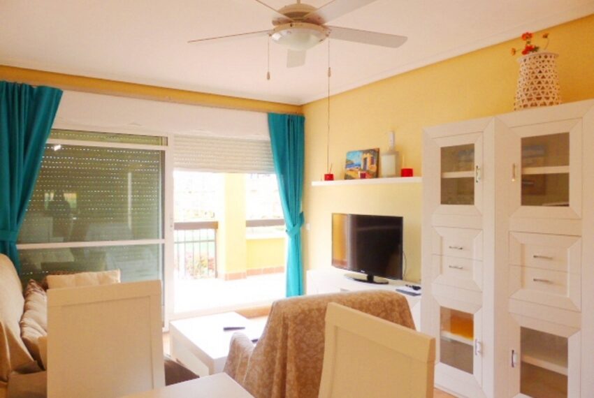 Urbanización Lomas del Mar II ,Apartamento coqueto , situado en primera planta sin ascensor , consta de dos dormitorios con armarios empotrados , amplio salón comedor, cocina americana equipada de menaje y electrodomésticos , terraza que se accede desde el salón , aire acondicionado con bomba de calor , piscina comunitaria y plaza de parking.