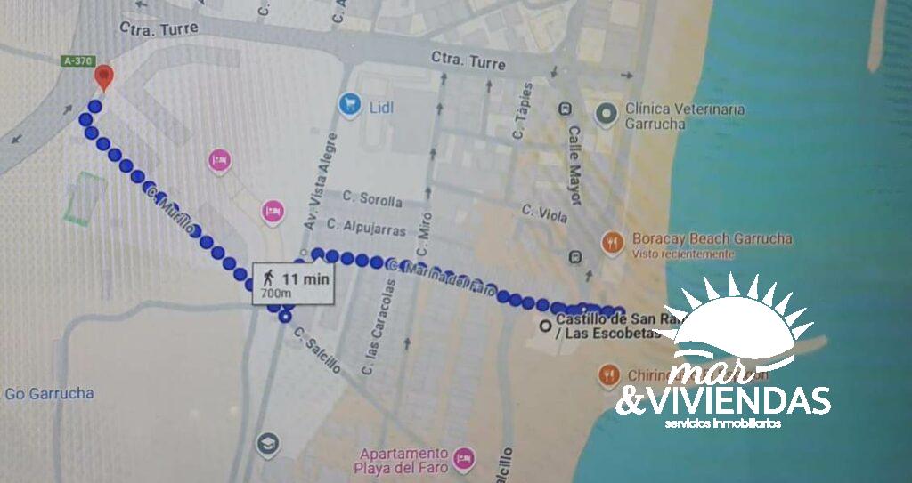 La playa se encuentra a 340 metros aproximados de la playa y a tan solo 5 minutos a pie del paseo marítimo de Garrucha, comúnmente denominado el malecón, que cuenta con kilómetro y medio de baranda de mármol y unos mimados jardines mezclados con la arena de la costa, que hacen de él una espléndida avenida sobre el mediterráneo, en él también podemos encontrar una gran variedad de comercios: restaurantes, heladerías, terrazas, tiendas…donde pasear, tomar el sol y tomar un baño es un placer para los sentidos.